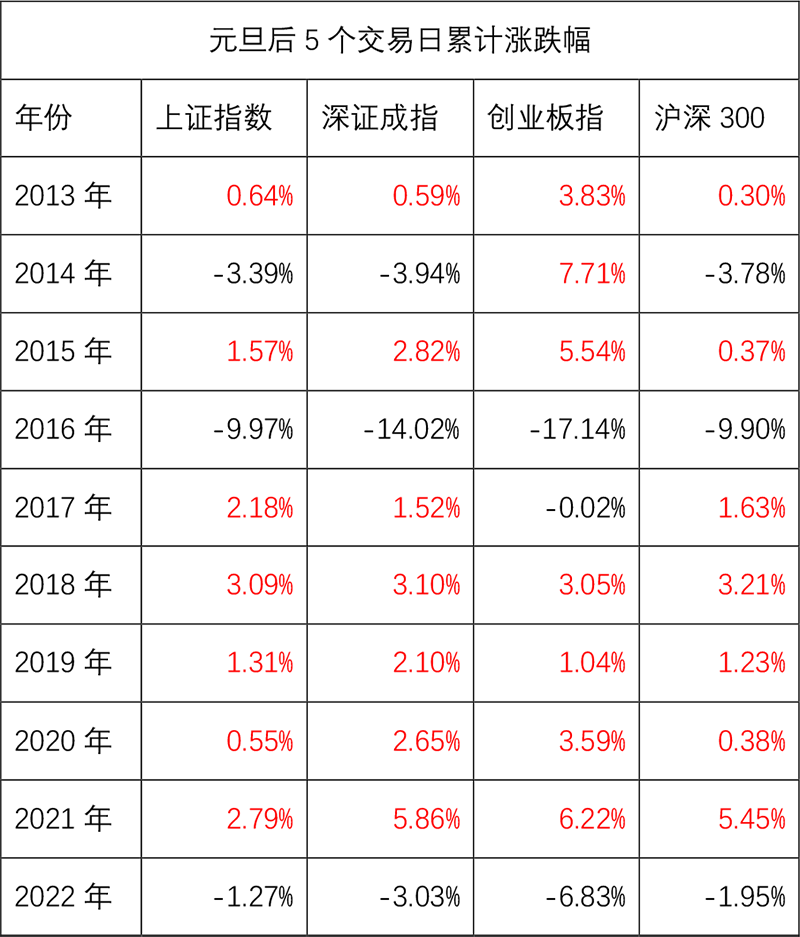 国金证券认为,上证指数、深证成指以及沪深300没有连续下跌的情况。考虑到2022年这些主要指数已经下跌,2023年元旦之后,市场上涨的概率或许更大。