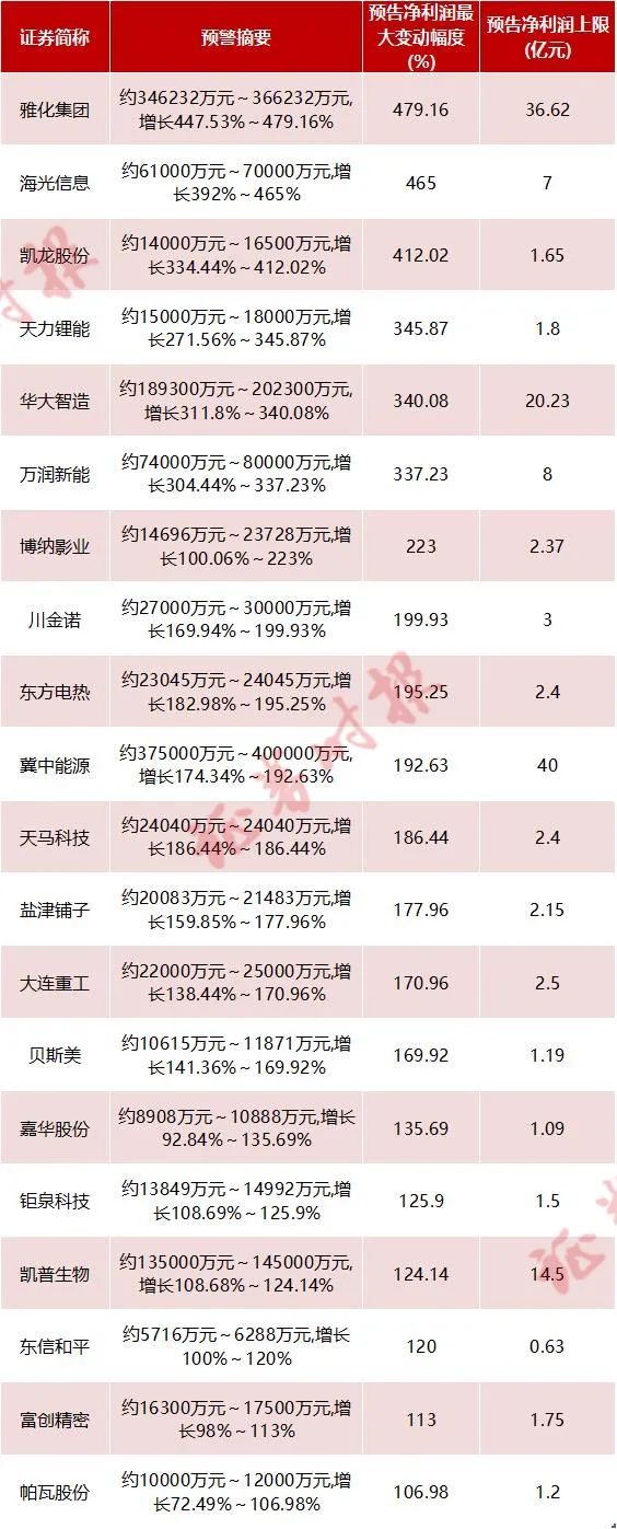 而以业绩最大变动幅度来看,20家公司业绩预告翻倍,其中,雅化集团、海光信息、凯龙股份业绩增幅超400%,雅化集团为目前的业绩“预增王”。