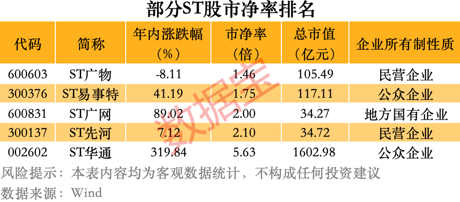 从市净率角度来看,ST广物、ST易事特均不足1.8倍,ST广网市净率为2倍。从企业所有制来看,ST广网是上榜公司唯一一家国企。资料显示,ST广网主营有线电视网络运营、广告代理、影视制作等。近年来,公司以智慧新广电为方向,加快由传统有线电视运营商向融合媒体运营商转型,形成了全媒体、多网络、综合性的业务体系和“有线+5G”融合发展新格局。目前,对家庭、酒店等大众客户,公司通过有线、无线、户户通、5G 等方式提供高标清数字电视、4K超高清电视、付费电视频道等直播业务产品,时移回看、互动点播、增值应用、互联网视频等互动增值业务产品,大带宽数据业务产品,广电5G语音通话、移动互联网等移动业务产品,以及数字家庭、智慧酒店等业务产品;对党政机关、企事业单位等集团客户,除上述业务产品外,还可以提供专网专线、视频监控、广电5G 行业应用、物联网、应急广播、系统集成、融合媒体、文化大数据、平安社区、数字乡村、算力服务、固定语音通话等业务产品。