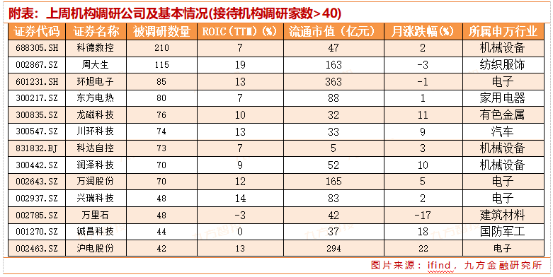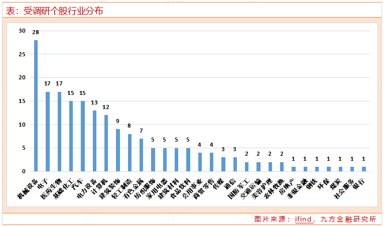 从行业分布来看,本周机械设备行业有28家上市公司接受调研;随后为电子、医药生物行业,均有17家上市公司接受调研。