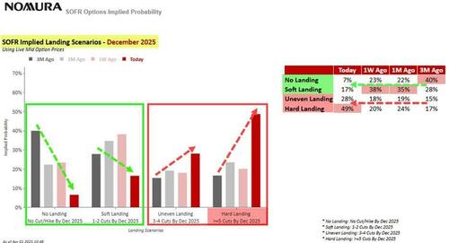 与此同时,围绕美国经济“硬着陆”的恐慌在近期也已被彻底引爆。SOFR期权隐含的概率分布反映出,不仅经济增长放缓加剧,令交易员押注将迫使美联储进一步降息,而且直接导致硬着陆/衰退的可能性也已越来越大。周二,期权定价反映的“硬着陆”已高达49%,而一周前还仅为20%。