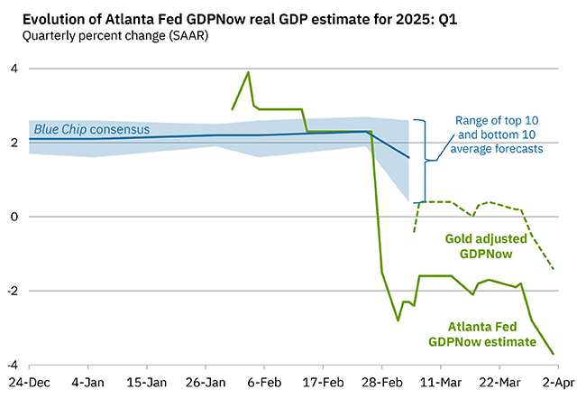 如下图所示,随着周二多组经济指标不佳,亚特兰大联储的GDPNow模型对2025年美国第一季度GDP的预估值在周二已进一步降至了-3.7%(3月28日的上一次预测为-2.8%)。即便是使用亚特兰大联储最近发布的一组剔除了黄金进口影响的“替代指标”,预测美国一季度GDP也将萎缩1.4%(上一次为-0.5%)。