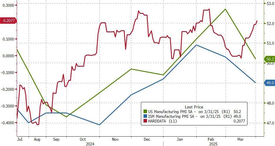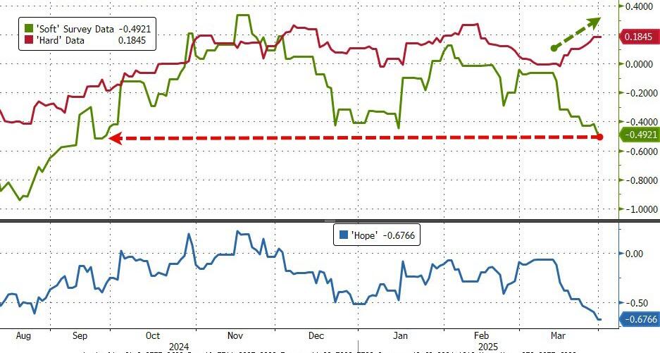 对于美联储而言,所有上述最新数据释放出的信息,无疑都是足以令官员们感到不安的信号。如下图所示,尽管美国硬数据依然坚挺,但“软”数据(各种调查)已经在昨日PMI数据发布后创下了六个月来新低: