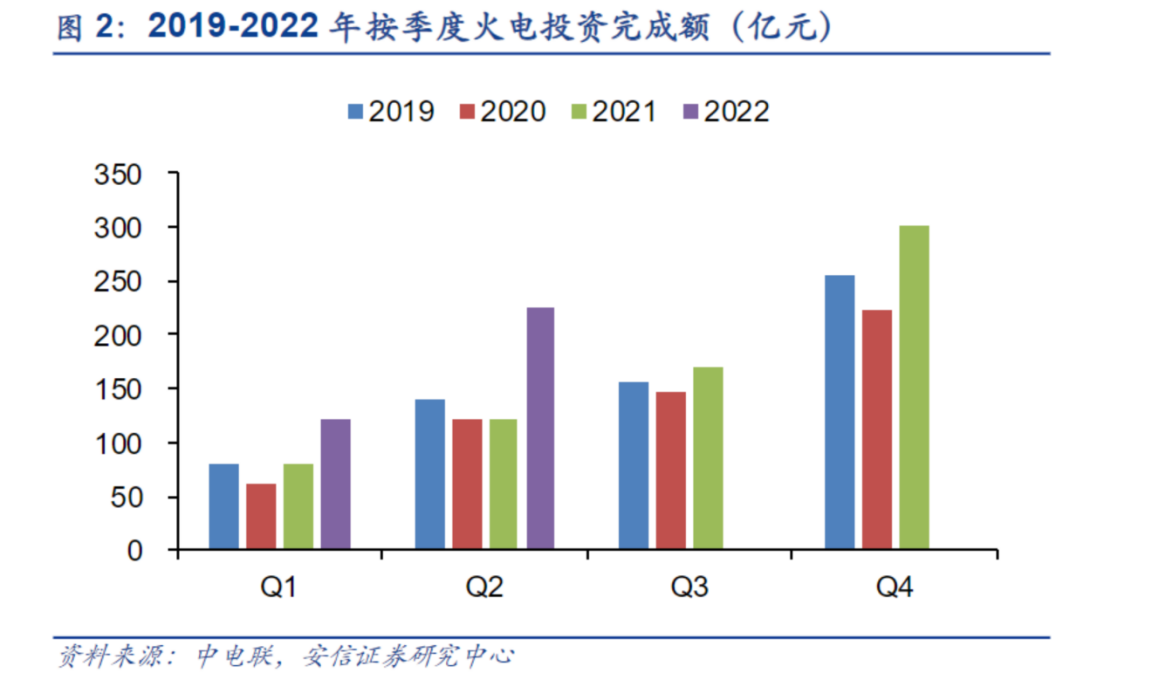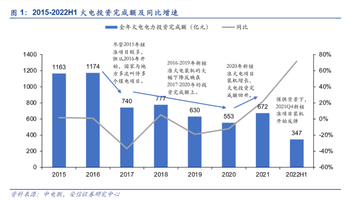 周喆指出,因产能过剩,2016-2020年我国火电投资额从1174亿元持续下滑至553亿元,2021年四季度以来受能源保供+调峰需求双重因素推动,火电投资迎来拐点,2022年上半年实现火电投资额347亿元,同比增长71.8%。