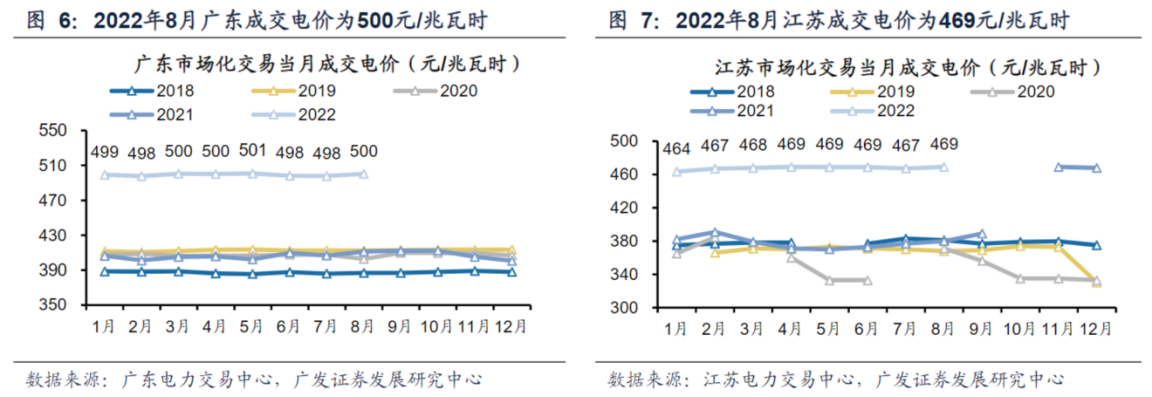 电价方面,参考广东、江苏两地市场交易情况来看,8月广东、江苏成交电价分别为500、469元/兆瓦时,环比基本持平,同比仍在高位。
