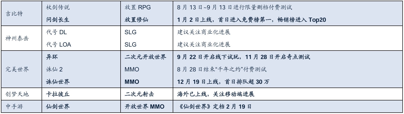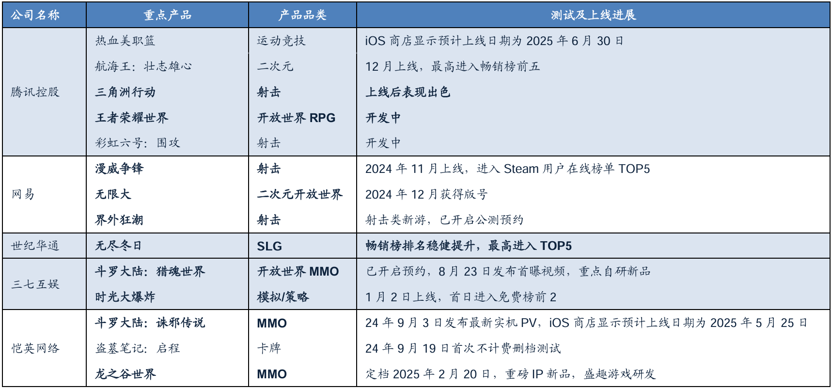 图:主要游戏公司近期重点产品测试进展及上线表现