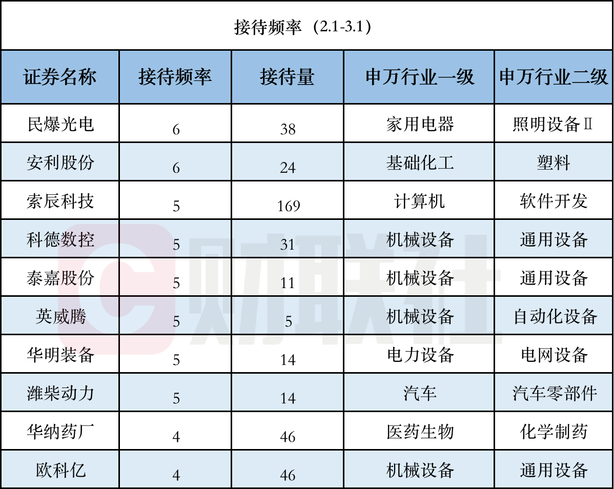 据Choice数据统计,截至3月1日收盘,沪深两市2月以来(2.1-3.1)共453家上市公司接受机构调研。具体来看,接待机构调研次数并列第一的上市公司分别为民爆光电和安利股份,机构调研次数均为6次,索辰科技、科德数控、泰嘉股份、英威腾、华明装备和潍柴动力并列第三为5次。