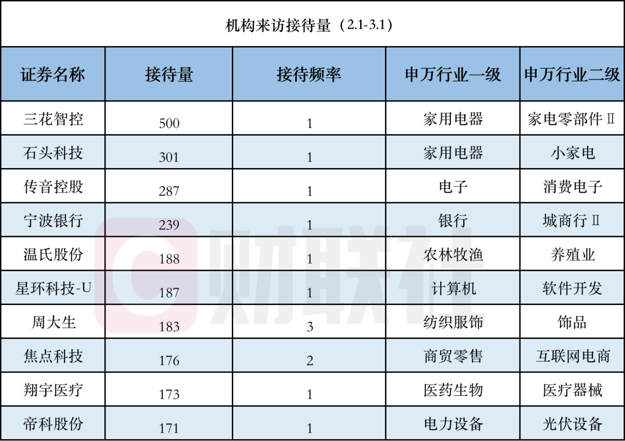 从机构来访接待量统计,三花智控、石头科技、传音控股、宁波银行、温氏股份、星环科技、周大生、焦点科技、翔宇医疗和帝科股份接待量位列前十,前三名三花智控、石头科技、传音控股来访机构接待量分别达500、301和287家。