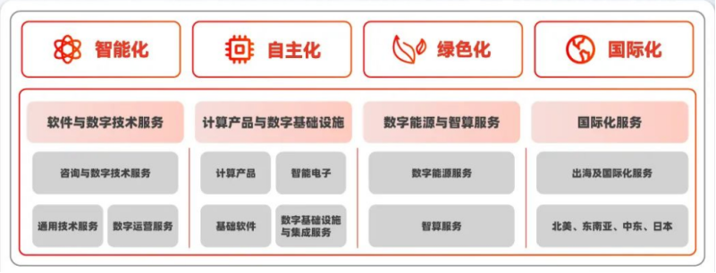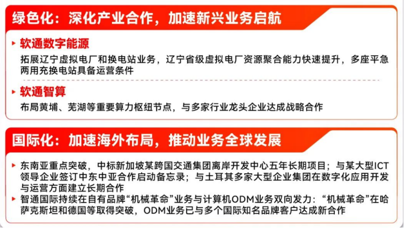 明确新时期“四大业务”增长战略,取得显著成效。公司在确保软件与数字技术服务业务市场竞争力的基础上,2024年2月完成了同方计算机的并购,强力构建计算产品与数字基础设施新的业务增长板块,同时将数字能源与智算服务作为新兴业务进行长期布局,并积极拓展国际市场。特别是在数字能源与智算服务板块,公司先后成立辽宁软通智新科技有限公司、软通智算科技(广东)集团有限公司,采用联营共建模式提供投建运一体化服务。在国际业务板块,公司在海外逐步构建起有效的营销和交付团队,随船出海和本地开拓并举,稳步推进北美和日本业务,加快东南亚和中东的业务布局及开拓。