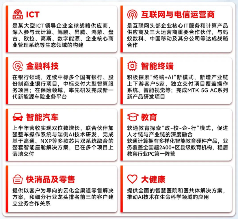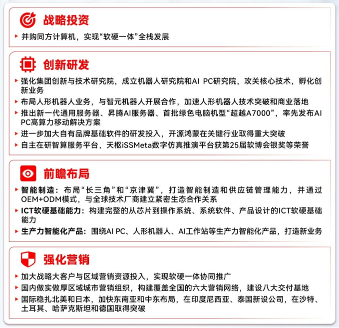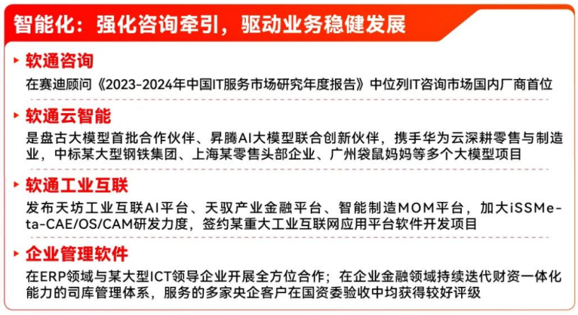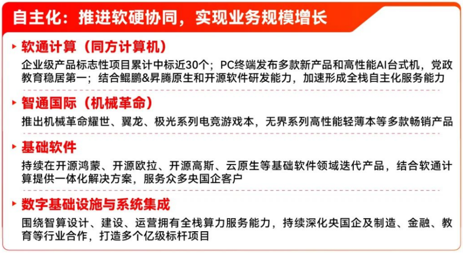 公司强化集团创新与技术研究院,成立机器人研究院和AI PC研究院;与智元机器人开展合作,布局人形机器人业务;在软硬件产品方面,进一步加大自有品牌基础软件的研发投入,开源鸿蒙在关键行业取得重大突破;软通计算推出新一代通用服务器、昇腾AI服务器产品,与英特尔合作推出首批绿色电脑机型“超越A7000”;智通国际率先发布AI PC高算力移动解决方案。