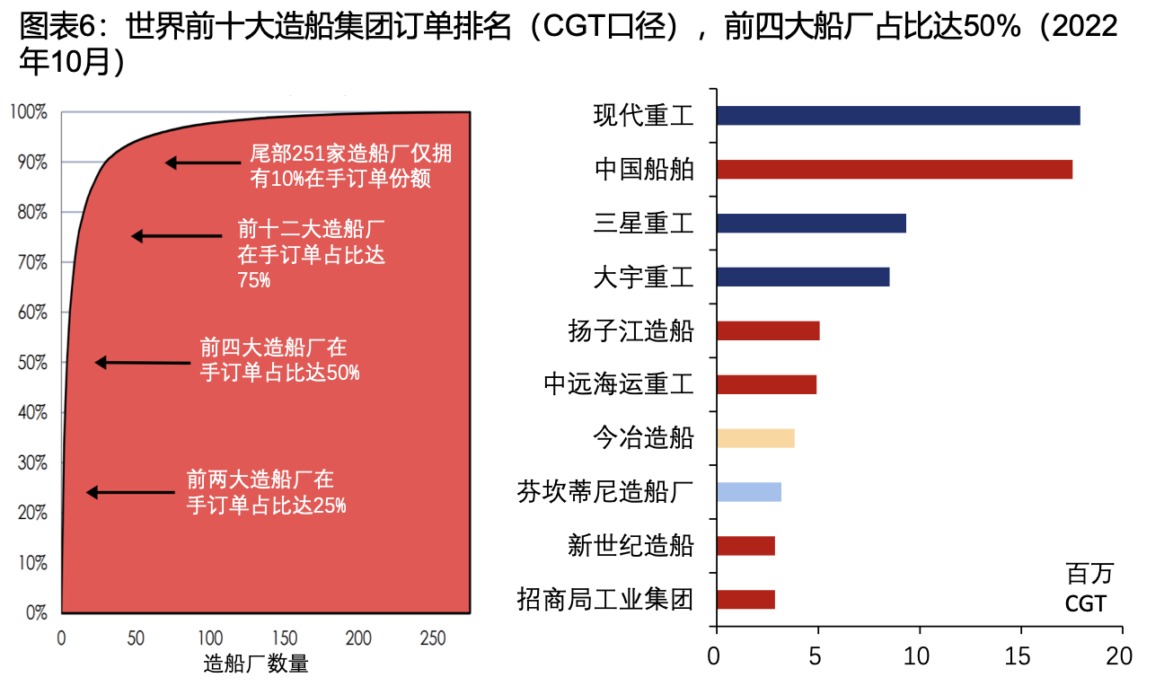 具体来看,当前全球造船市场高度集中于头部船厂,中韩两国抢占造船业头把交椅的激烈竞争实则是全球头部厂商的争夺战。数据显示,全球订单排名前四的船厂分别为我国的中国船舶以及韩国的现代重工、三星重工和大宇重工。