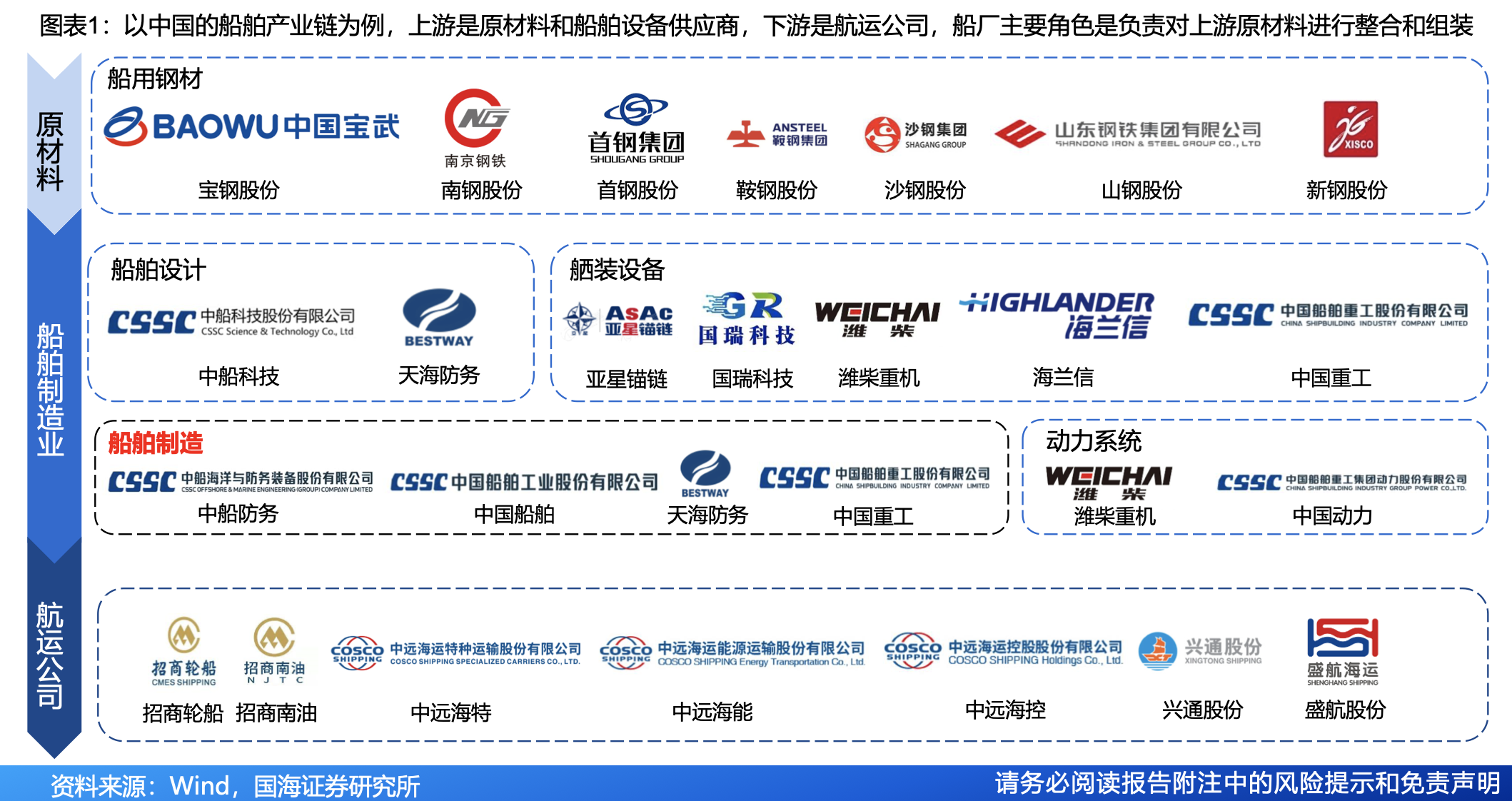 产业链细分方面,船舶工业位于整个产业链的中游,包括船用配套设备、造船厂、拆船厂等,上游为生产船舶所需的原材料,如造船板、油漆、电缆等,下游为承担海上运输贸易的航运业。