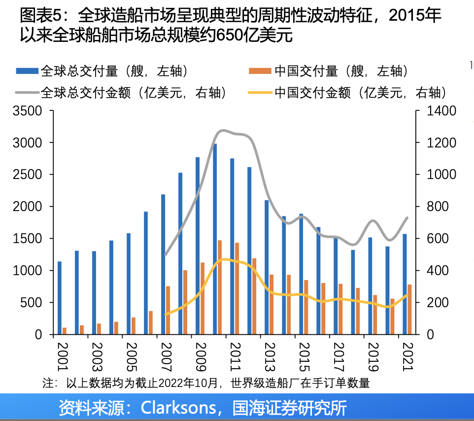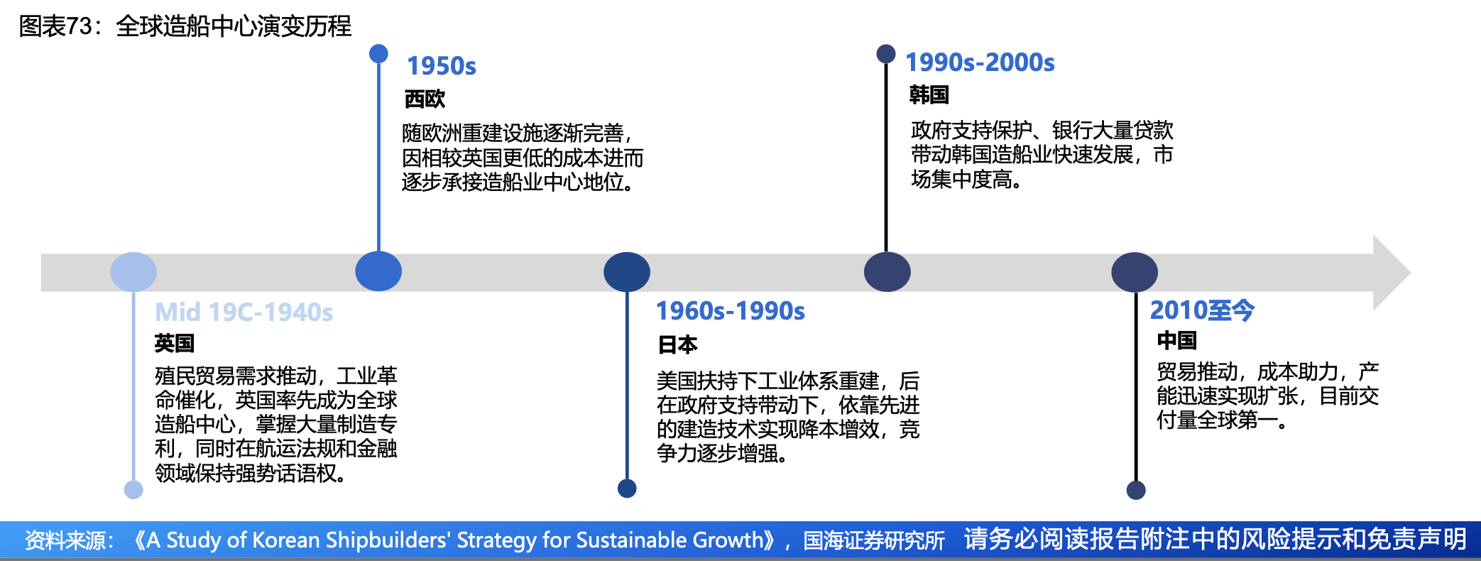 国海证券研报指出,船舶行业是典型的周期性行业,与全球宏观经济相关性较大,且全球制造中心每隔10-30年发生一次演变。韩国在2000年超越日本成为全球最大造船国。而中国在上轮周期中依托较日韩在生产成本上的明显优势以及本国贸易需求大繁荣,借助航运周期2008年被推向高潮的契机强势崛起,市场份额快速提升。