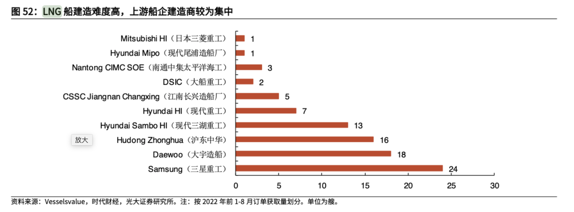 不过,在中国船舶快步直追下,两国在LNG船建造领域的差距正快速缩小。集团旗下沪东中华是国内首家具备LNG船建造能力的中国船厂。韩倩婷表示,得益于俄乌冲突带来LNG运输船订单暴增的历史机遇,去年1-10月中国取得24%的LNG市场订单,沪东中华已获得批量订单。同时,光大证券研报提到,LNG运输船领域与韩国的技术差距也在不断缩小。沪东中华2021年推出的“长恒系列”大型LNG运输船在技术性能、建造效率、交付时间上,基本与韩国企业处于同一水平;江南造船和大船重工采用MarkIII路线,也具备一定建造实力。