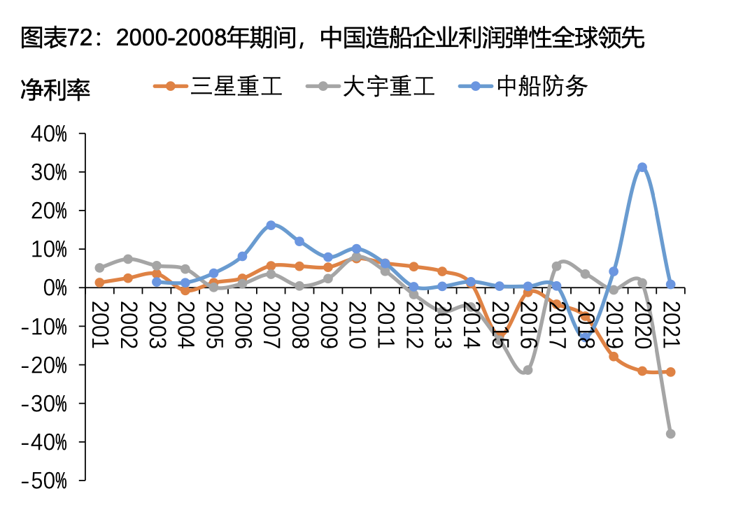 另一方面,根据国海证券研报数据,近年来三星和大宇的造船净利率出现明显下滑,而与之相比,中国船舶则保持较为稳定的趋势,且以旗下中船防务为例,其利润弹性在2000年-2008年时就已远超韩国的三星和大宇。值得注意的是,实际上韩国三大船厂经营已长期处于亏损状态。其中,去年上半年大宇造船亏损约4.34亿美元,现代重工亏损超过5亿美元,三星重工亏损超过2.5亿美元。