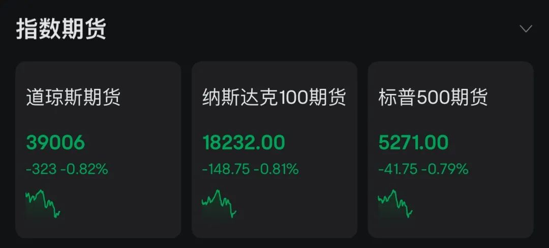 截至发稿,纳斯达克100指数期货、标普500指数期货、道指期货均走低,早盘均一度跌超1%。