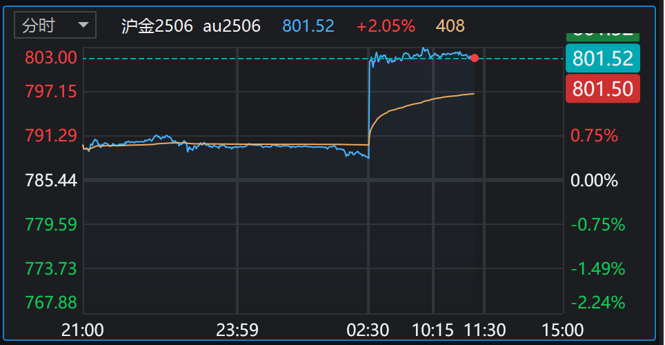 受美元走弱影响,黄金持续高涨。国际金价、国内金价再次创历史新高。沪金期货主力合约早盘直线拉升,最新报801.52元/克,涨超2%。