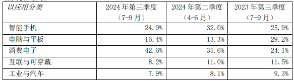 聚焦中芯国际第三季度营收,按应用分类,收入占比分别为:智能手机24.9%、电脑与平板16.4%、消费电子42.6%、互联与可穿戴8.2%、工业与汽车7.9%。