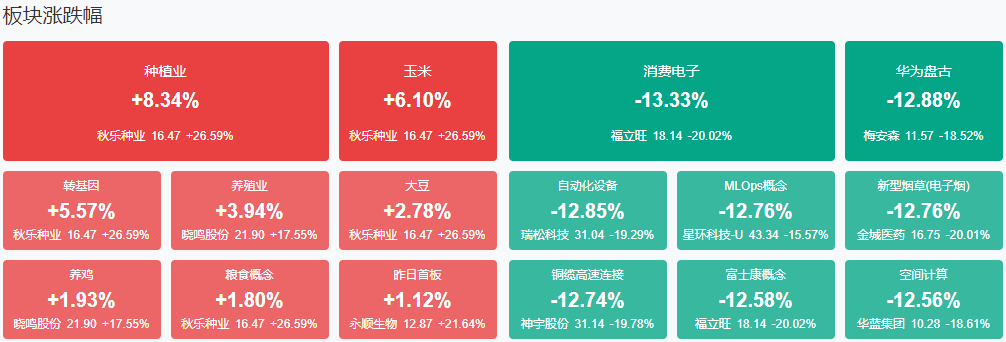 板块方面,农业、养鸡等少数板块上涨,消费电子、CPO、Sora概念、电池等板块跌幅居前。截至收盘,沪指跌6.34%,深成指跌8.01%,创业板指跌9.74%。