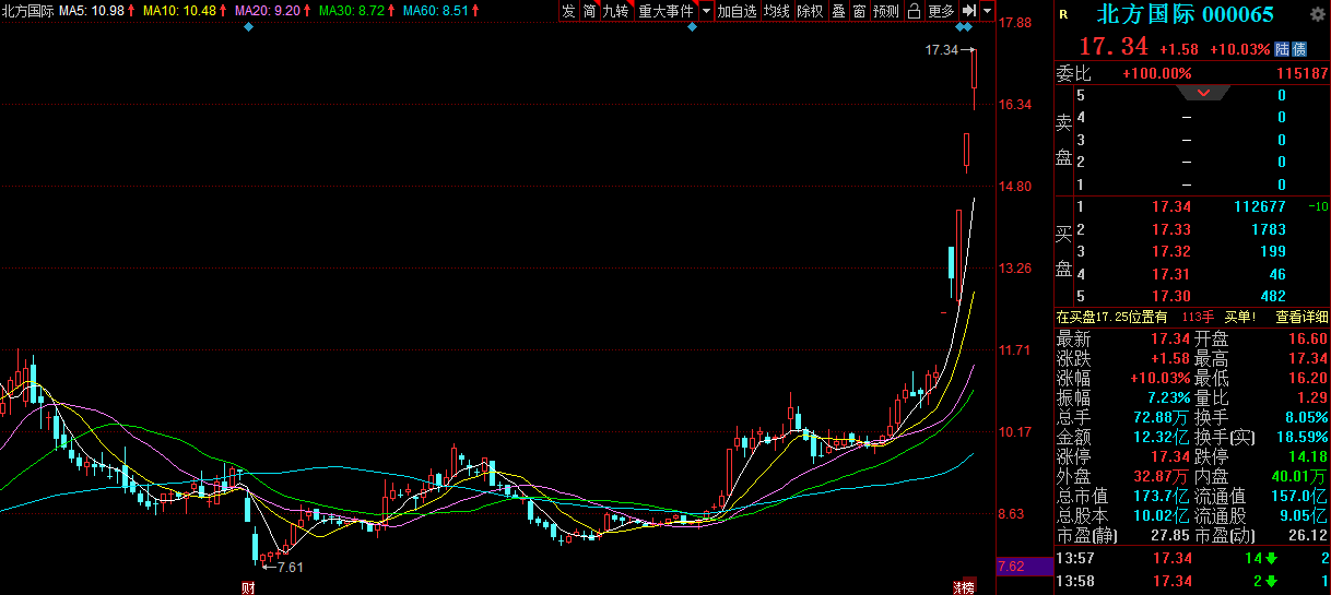3月17日,北方国际再次迎来涨停,截至发稿,报17.34元,成交额12.32亿元。