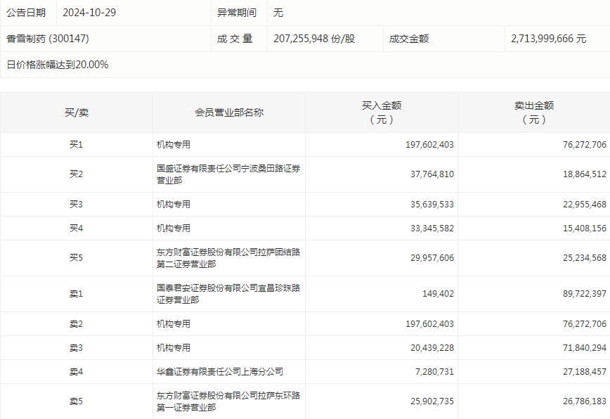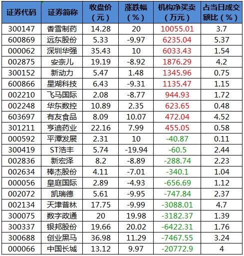 龙虎榜机构净买入10股 香雪制药居首