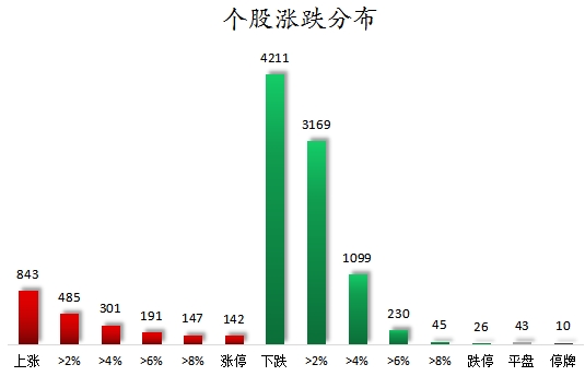 个股涨跌情况,截至收盘,沪深两市合计843只个股上涨,4211只个股下跌,平盘个股43只,停牌的个股10只。不含当日上市新股,共有142只个股涨停,26只个股跌停。