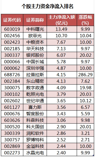 个股来看,今日有1376个股获主力资金净流入,其中,59股获主力资金净流入超1亿元。中科曙光主力资金净流入最多,净流入金额为13.49亿元;主力资金净流入居前的个股还有欧菲光、中粮资本、华天科技、银邦股份、中国长城,净流入金额分别为10.7亿元、7.67亿元、7.13亿元、6.07亿元、5.78亿元。