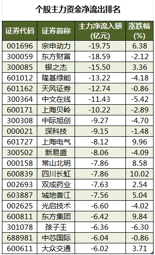 今日有3716只个股被主力资金净卖出,其中,250股被主力资金净卖出超1亿元。主力资金净流出最多的个股是宗申动力,净流出金额为19.75亿元;主力资金净流出居前的个股还有东方财富、银之杰、隆基绿能、天风证券、中文在线,净流出金额分别为18.59亿元、15.5亿元、13.22亿元、12.74亿元、11.43亿元。