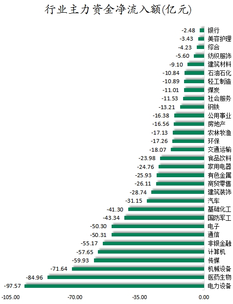 从行业来看,申万所属的31个一级行业,今日所有行业主力资金都呈现净流出,其中,电力设备行业主力资金净流出最多,净流出金额为97.57亿元;行业主力资金净流出靠前的还有医药生物、机械设备、传媒、计算机、非银金融、通信、电子,净流出金额分别为84.96亿元、71.64亿元、59.93亿元、57.65亿元、55.17亿元、50.31亿元、50.3亿元。