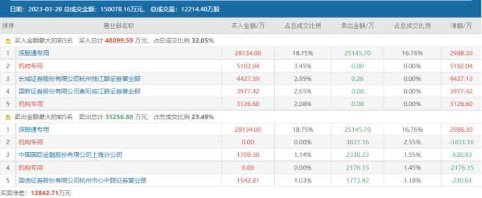 受消息提振,荣盛石化今日时隔近一年(2022年3月10日)以来首次涨停。从资金面来看,其同时获北向资金及机构的共同助力。据今日(3月28日)龙虎榜数据显示,其上榜营业部席位全天成交4.8亿元,且单日净买入额近1.3亿元。买入榜前五席位中,深股通累计买入2.81亿元并卖出2.51亿元(净买入近3000万元),两家机构分别净买入5200万元、3100万元。