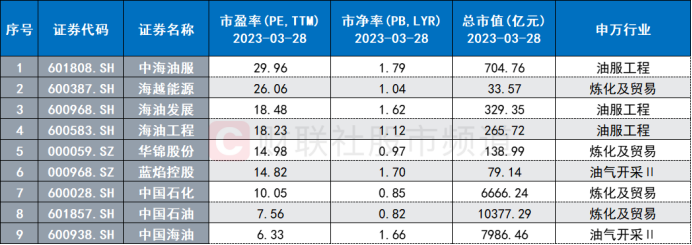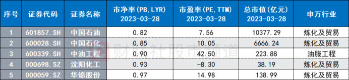 注:市净率、市净率较低的石油石化个股(截至3月28日收盘)