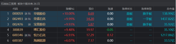 今日(3月28日),石油化工概念热度大增,相关个股迎来爆发。截止收盘,千亿市值级龙头股荣盛石化一字涨停,华锦股份、宝莫股份也成功封板涨停,博汇股份涨超9%,中油工程、恒力石化、海越能源、通源石油等股也涨幅居前。