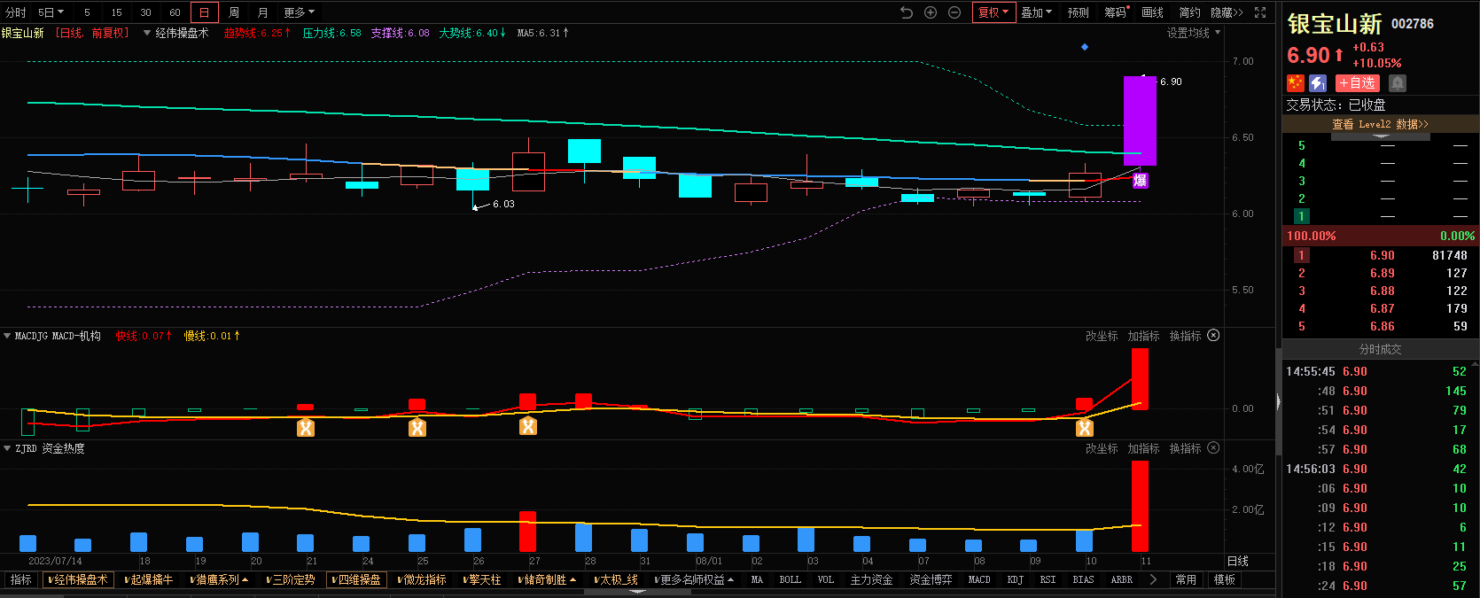 3)参考技术指标:银宝山新-经伟操盘术-指标出现爆点信号和红色线。