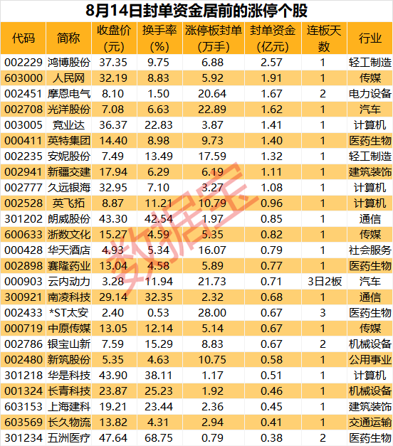 以封单金额计算,9股封单金额超亿元,鸿博股份、人民网、摩恩电气封单资金居前,分别为2.57亿元、1.91亿元、1.67亿元。