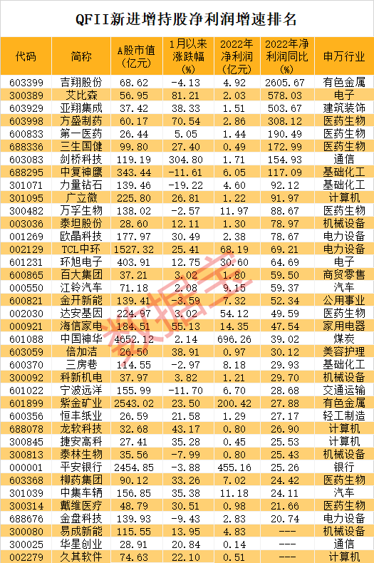 从业绩数据来看,QFII新进增持股中,2022年净利润增速超20%或同比扭亏的股票有38只。吉翔股份、艾比森、亚翔集成净利润增速超5倍。