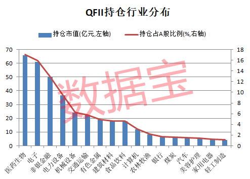 证券时报·数据宝统计,截至4月4日,169股的前十大流通股东名单中出现QFII的身影,QFII合计持仓市值达383.63亿元。医药生物、电子、非银金融、电力设备等行业的QFII持仓市值均超30亿元,占比超过一半。