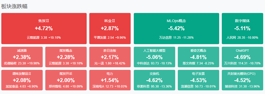 板块方面,煤炭、减速器、电力、食品加工等板块涨幅居前,ChatGPT、数据要素、游戏、传媒等板块跌幅居前。