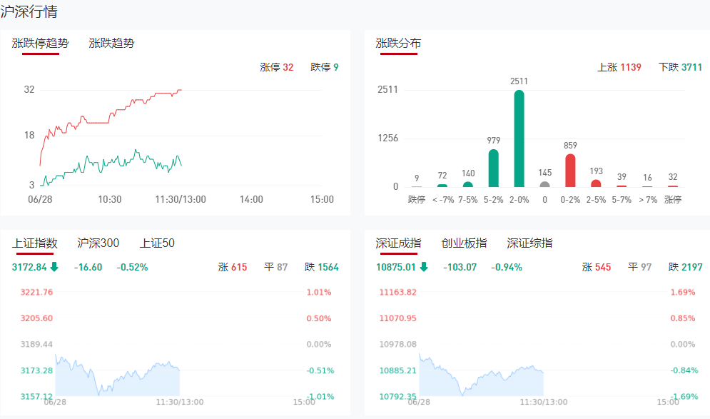 截至上午收盘,沪指跌0.52%,深成指跌0.94%,创业板指跌0.84%。