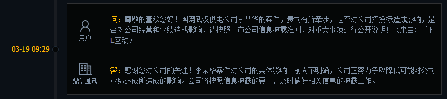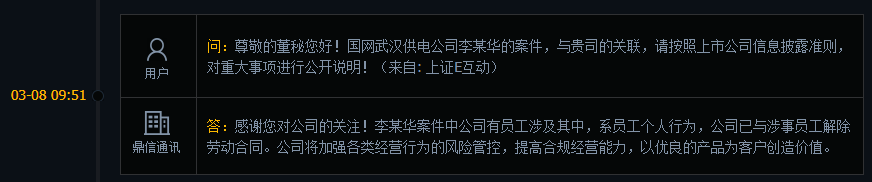 3月8日和3月19日,投资者曾问及国网武汉供电公司李某华案,是否对公司招投标造成影响。当时鼎信通讯分别回应称,“李某华案件中公司有员工涉及其中,系员工个人行为,公司已与涉事员工解除劳动合同。”“李某华案件对公司的具体影响目前尚不明确,公司正努力争取降低可能对公司业绩达成所造成的影响。公司将按照信息披露的要求,及时做好相关信息的披露工作。”