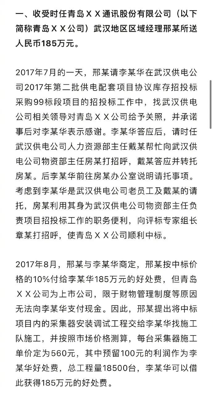 2023年12月底,中国裁判文书网公布的一份“李某华受贿一审刑事判决书”显示,曾担任国网湖北省电力有限公司武汉供电公司班长的李某华,在5年时间里受贿689.7万元,其中青岛某通讯股份有限公司武汉地区区域经理邢某就送了185万元。
