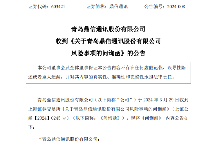 与此同时,鼎信通讯还在凌晨披露收到上交所发出的问询函。