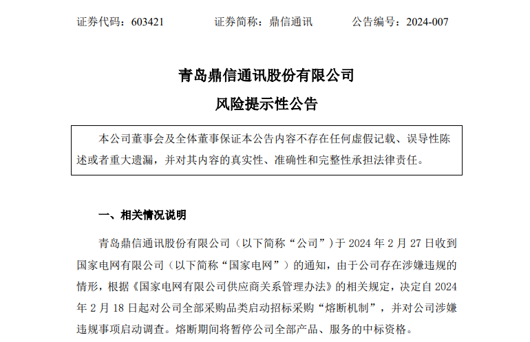 3月29日晚间,鼎信通讯披露风险提示性公告,称公司于2月27日收到国家电网有限公司(以下简称“国家电网”)的通知,由于公司存在涉嫌违规的情形,决定自2月18日起对公司全部采购品类启动招标采购“熔断机制”,并对公司涉嫌违规事项启动调查。熔断期间将暂停公司全部产品、服务的中标资格。