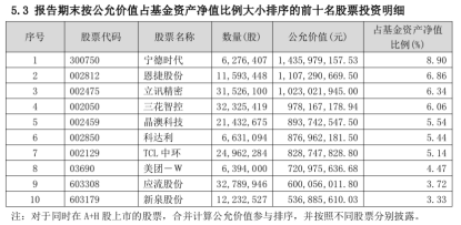 该基金前十大重仓股为宁德时代、恩捷股份、立讯精密、三花智控、晶澳科技、科达利、TCL中环、美团-W、应流股份、新泉股份,合计占基金资产净值的比例为55.8%。