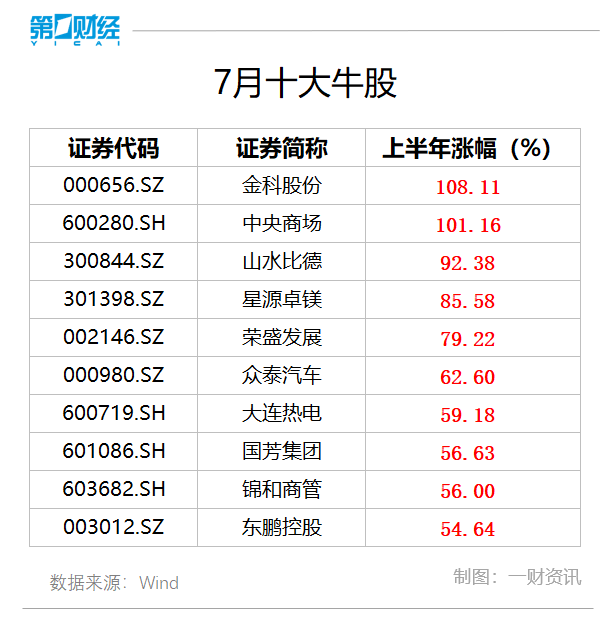 在剔除上半年上市的新股后,截至7月28日收盘,7月十大牛股中涨幅最大的为金科股份,累计涨幅达108.11%,其中2只牛股涨幅超过100%。金科股份、荣盛发展均为房地产行业牛股。