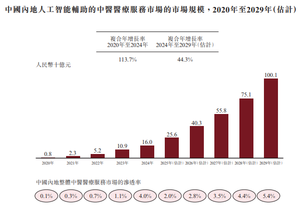 公开资料显示,就收入而言,2024年人工智能辅助的中医医疗服务市场规模约为160亿元,2020-2024年复合年增长率为113.7%。预计到2029年,该市场的规模有望突破千亿,未来几年的复合年增长率依然将高达44.3%。