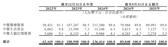 拆分结构来看,问止中医的收入主要分为三大块,其中中医医疗服务是公司的第一大收入来源,22-24年分别贡献收入5042.1万元、1.67亿元、2.11亿元,占比81.1%、88.5%、89.6%。同期,中医生活产品收入占比分别为9.8%、7.2%、6.3%,中医大脑订阅服务收入占比分别为9.1%、4.3%、4.1%。