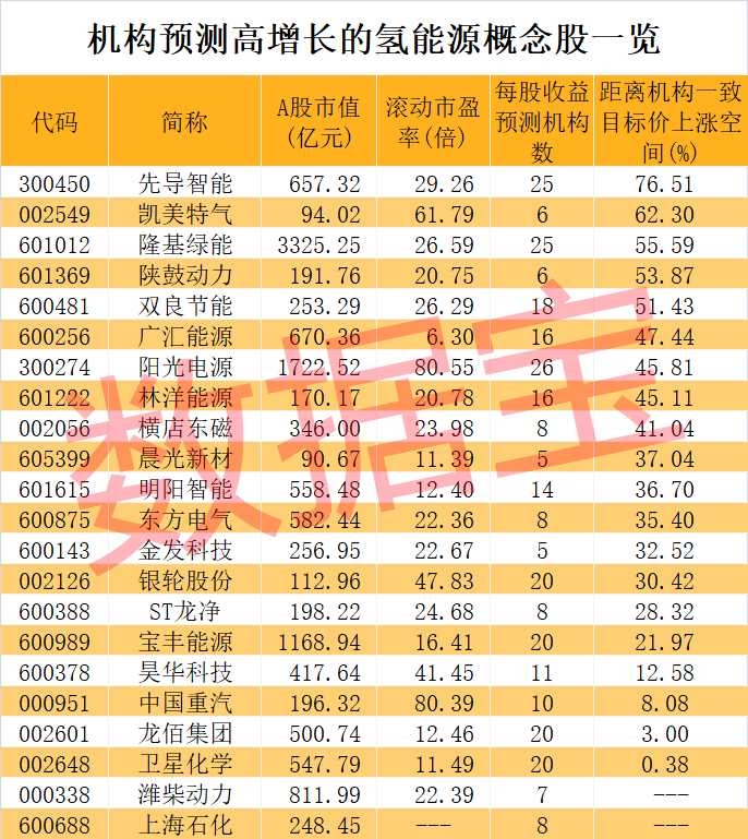哪些股票未来具备高增长潜力?根据5家以上机构一致预测,22只氢能源概念股今后两年净利润增速均有望超过20%。3只千亿市值的行业龙头入围其中,包括隆基绿能、阳光电源、宝丰能源等。