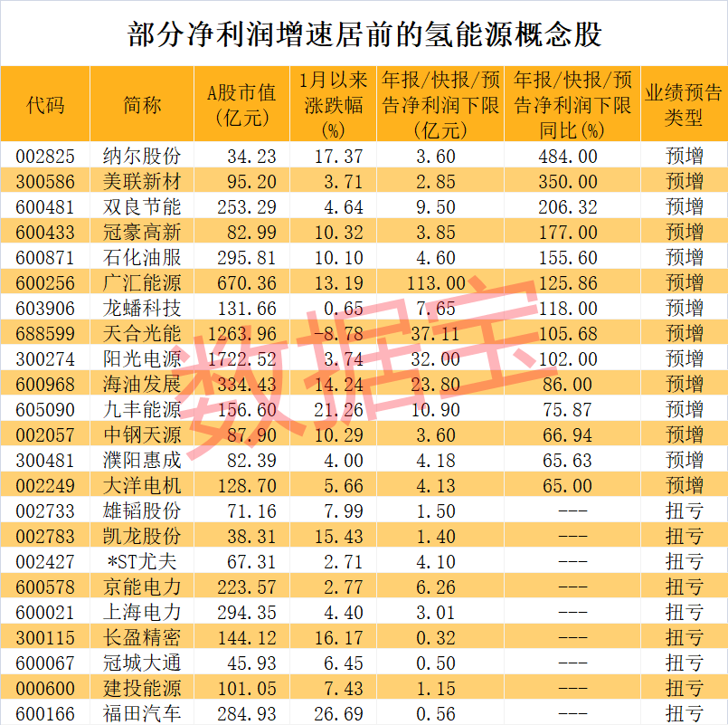 证券时报·数据宝统计,从目前公布的业绩数据来看,按照年报、快报、预告净利润下限计算,2022年业绩预喜的占比接近一半。京城股份、雄韬股份、凯龙股份、京能电力、上海电力等净利润预计扭亏。纳尔股份、美联新材、双良节能、冠豪高新、石化油服等净利润预计翻倍增长。