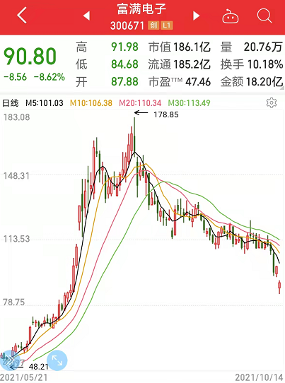早前,富满电子披露前三季度业绩预告,公司预计2021年前三季度实现归属净利润4.95亿元至5.15亿元,比上年同期上升704.54%至737.04%。业绩大增,股价大跌,今日富满电子低开低走,盘中跌幅一度超过14%,收盘跌8.62%。与富满电子情况类似的还有江特电机,披露三季报后今日股价跌停。