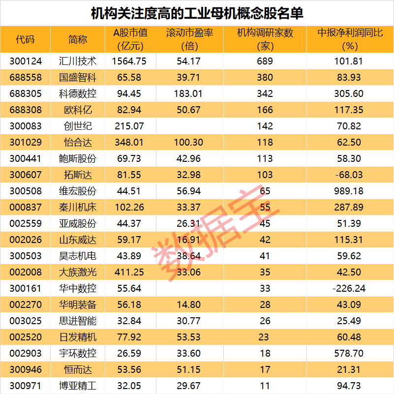 科德数控、汇川技术、国盛智科、欧科亿等8只工业母机概念股今年均获超百家机构调研。
